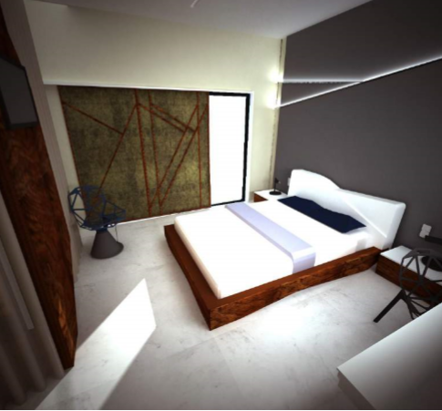 Αφετηρία του σχεδιασμού ήταν οι λοξές, ξύλινες τραβέρσες του κρεβατιού σε συνδυασμό με το κεφαλάρι του καθώς σε ένα μέσο, μονόχωρο δωμάτιο ξενοδοχείου θεωρήσαμε ότι το κρεβάτι είναι η βάση για τη δημιουργία της επιθυμητής ατμόσφαιρας. H γεωμετρικά ακανόνιστη κρεβατοκάμαρα δίνει το μοτίβο της στα υπόλοιπα ξύλινα στοιχεία όπως στη ντουλάπα, το γραφείο και τα επάλληλα φύλλα με το black out ύφασμα που ρυθμίζουν τη συσκότιση του δωματίου.